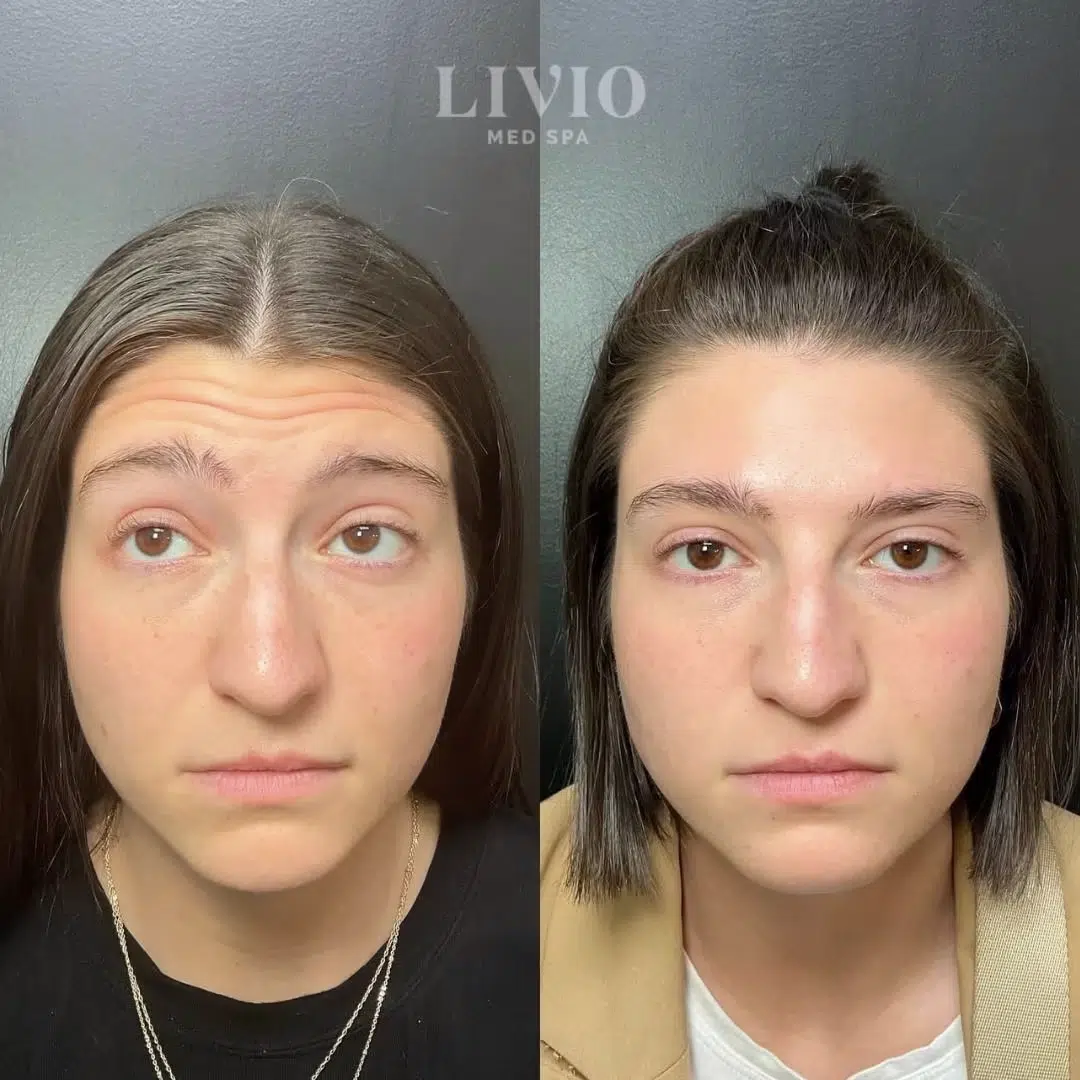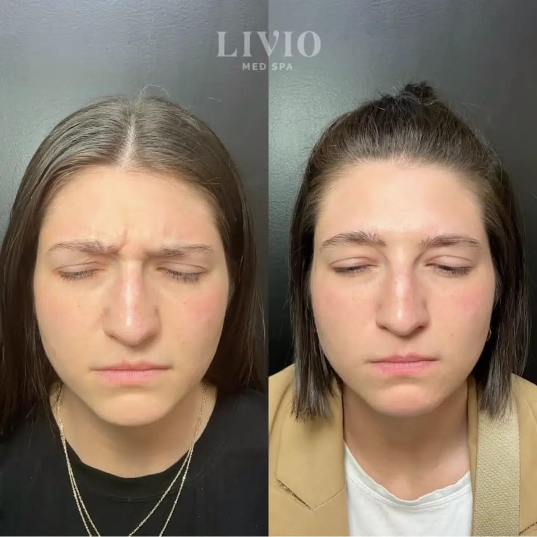 This patient received neurotoxin to the glabella and frontalis to smooth frown lines and forehead wrinkles, creating a more relaxed and refreshed appearance.