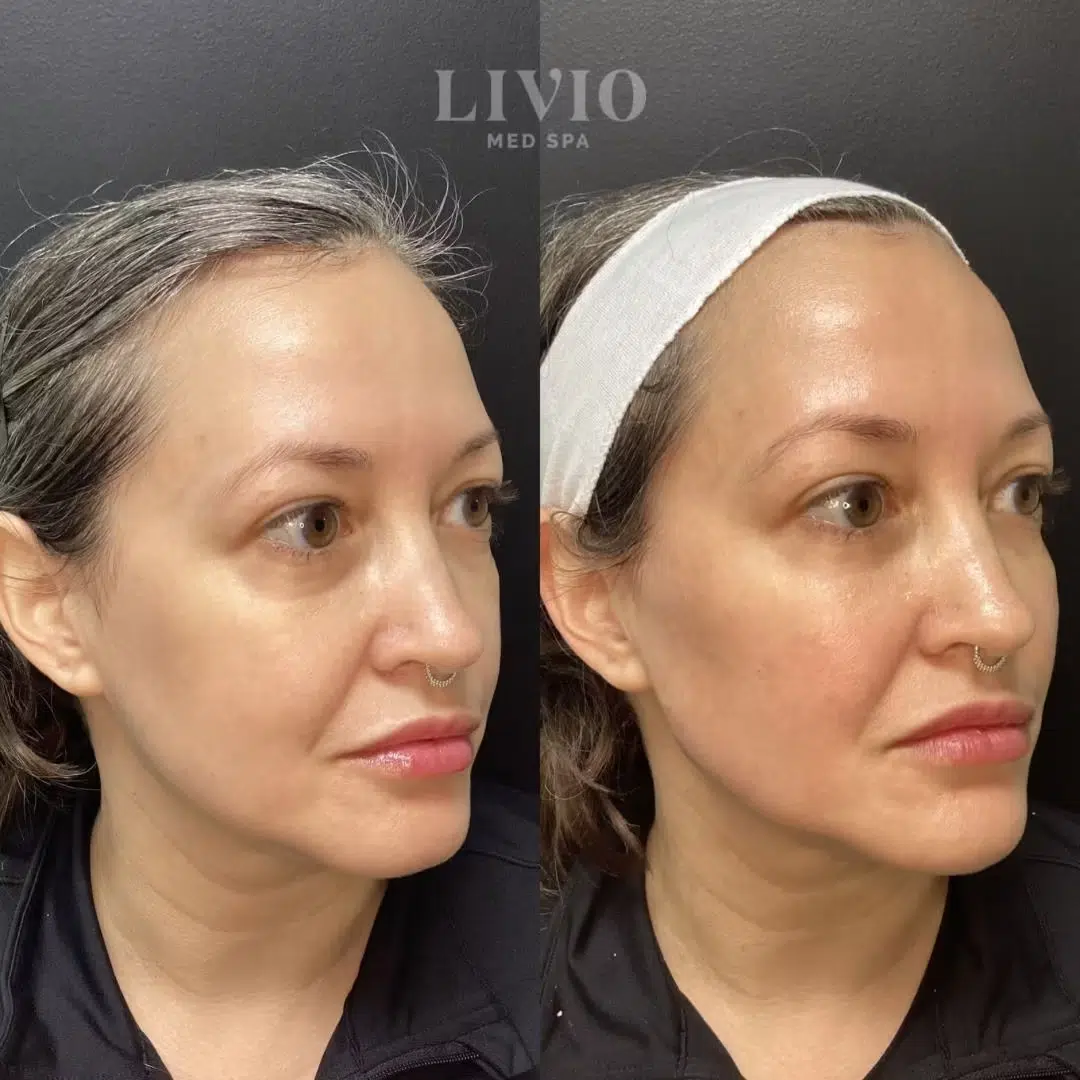 This patient received 4 syringes in her midface to restore volume and enhance natural contours, creating a lifted and youthful appearance while addressing mid-face volume loss.